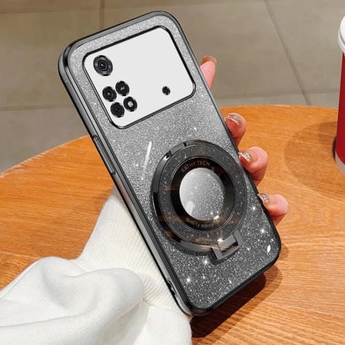 Funda de Teléfono de TPU con Soporte Redondo y Purpurina Degradada Plateada para Xiaomi Poco M4 Pro (Negro)