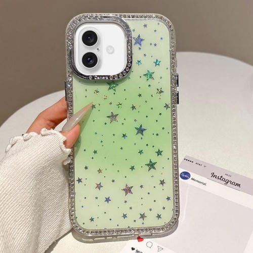 Funda híbrida de TPU con patrón holográfico de estrellas y cobertura total IMD para iPhone 17 (verde)
