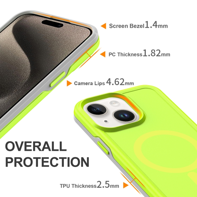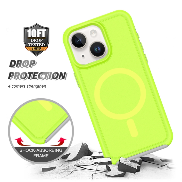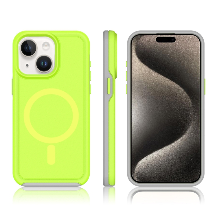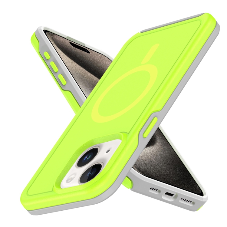 Funda híbrida TPU y PC para iPhone 15 Plus con Protección Magsafe a prueba de golpes (Verde Fluorescente y Gris)