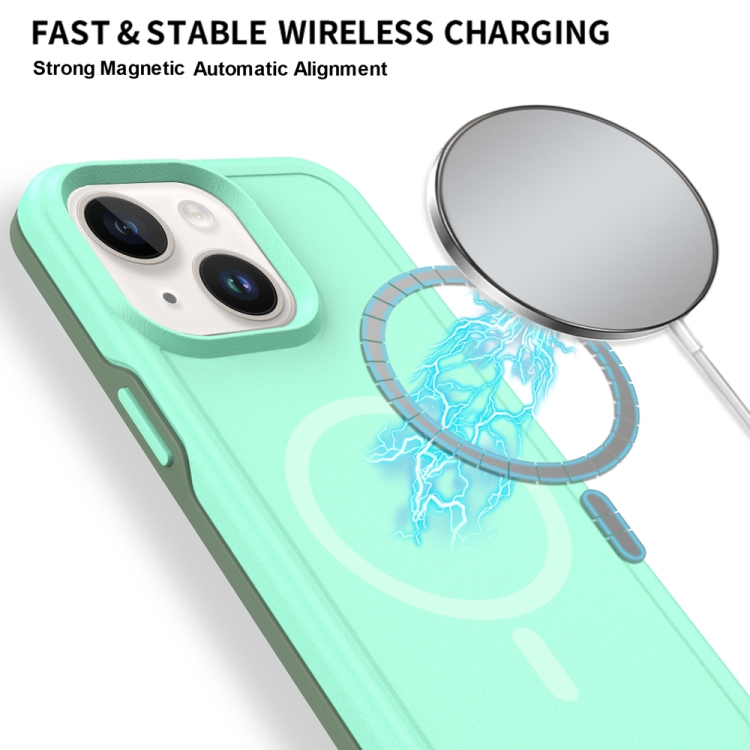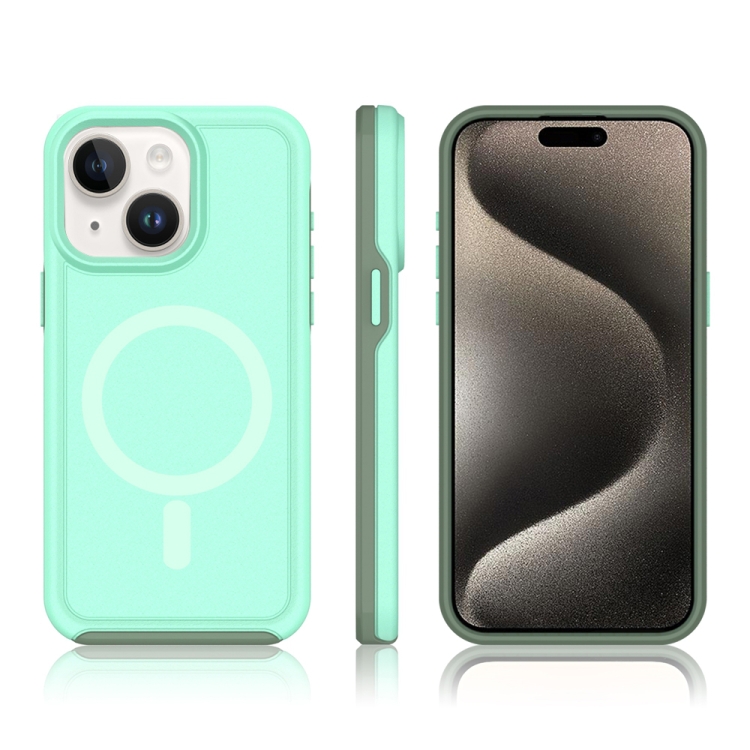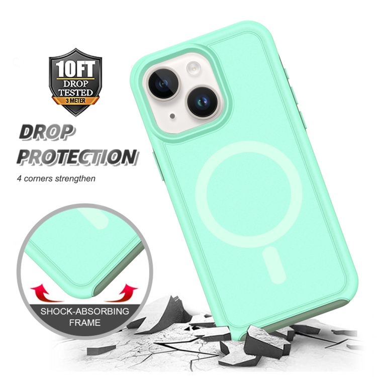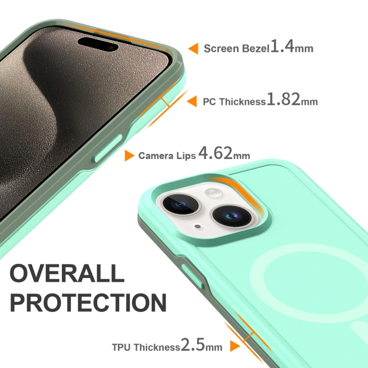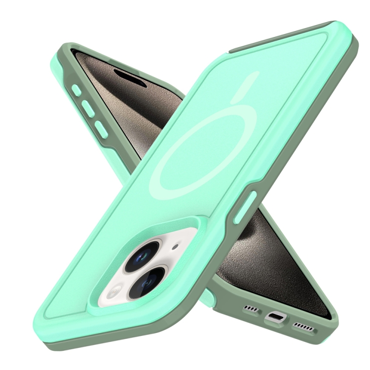 Funda híbrida TPU y PC para iPhone 15 Plus con Protección Magsafe a prueba de golpes (Verde Menta y Verde Grisáceo)
