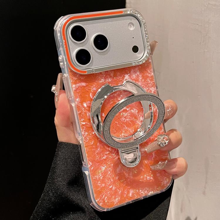 Funda para iPhone 17 Pro Max con carcasa dorada y colorida, diseño estampado en TPU+IMD, con soporte magnético brillante (naranja).