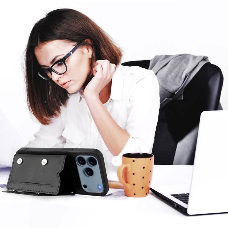 Funda para iPhone 17 Pro Max con cuatro ranuras para tarjetas y correa para la muñeca (negra)