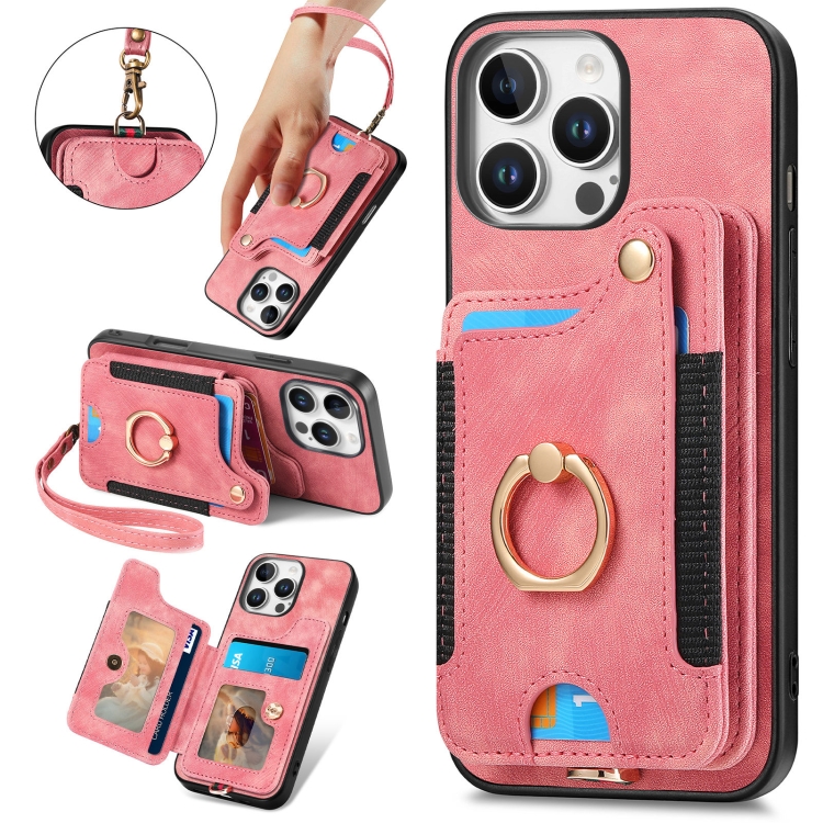 Funda para Teléfono con Billetera MultiTarjeta de Piel Sintética con Anillo para iPhone 16 Pro (Rosa)