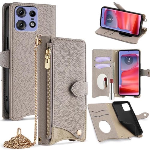 Funda de Cuero de Lichi con Diseño Cola de Pez y Cadena Cruzada para Motorola Edge 50 Pro (Gris)