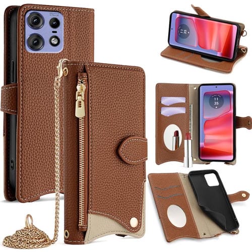 Funda de Cuero de Lichi con Cadena Cruzada y Cola de Pez para Motorola Edge 50 Pro (Marrón)