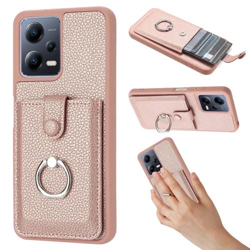 Funda para Teléfono con Diseño de Textura de Lichi y TaRJetero con Anillo para Redmi Note 12 5G (Oro Rosa)