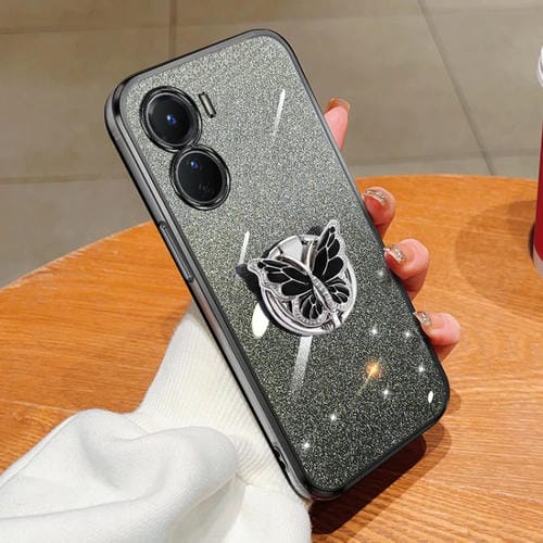 Funda para Teléfono de TPU con Soporte y Mariposas con Purpurina Degradada Plateada para Vivo Y16 (Negro)