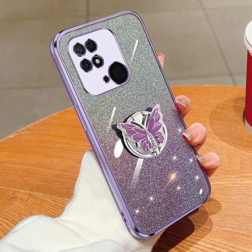 Funda para Teléfono Redmi 10C con Soporte de Mariposa con Purpurina Degradada En TPU (Morado)
