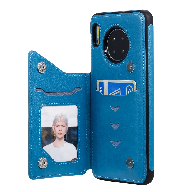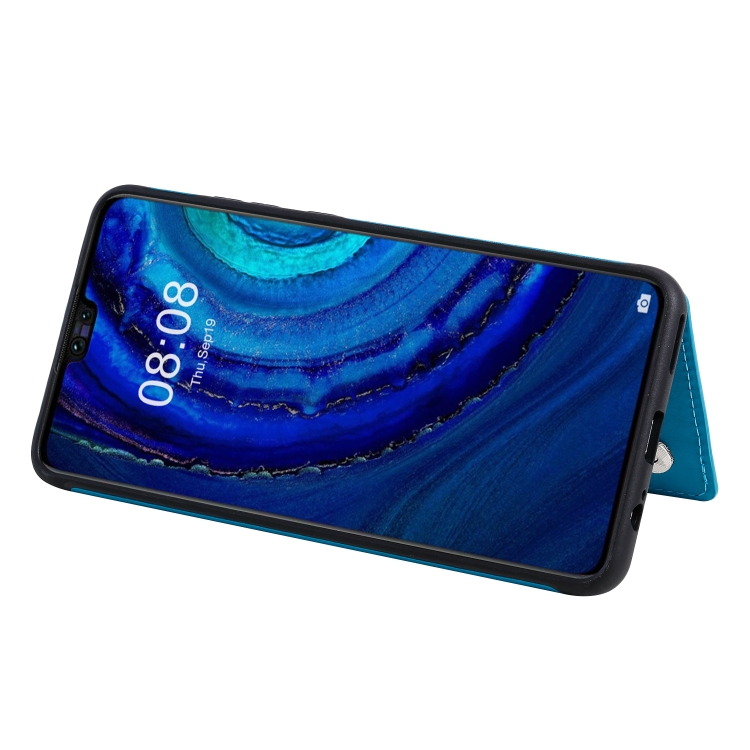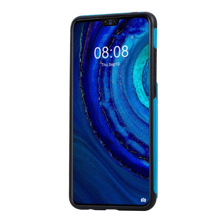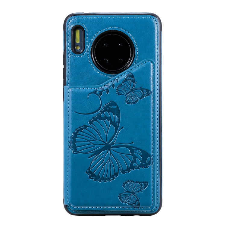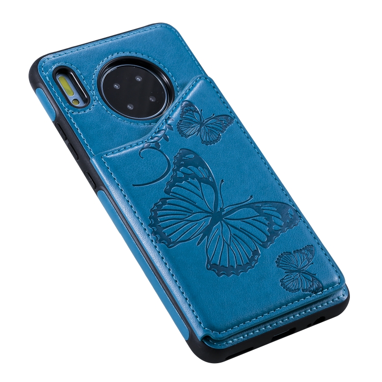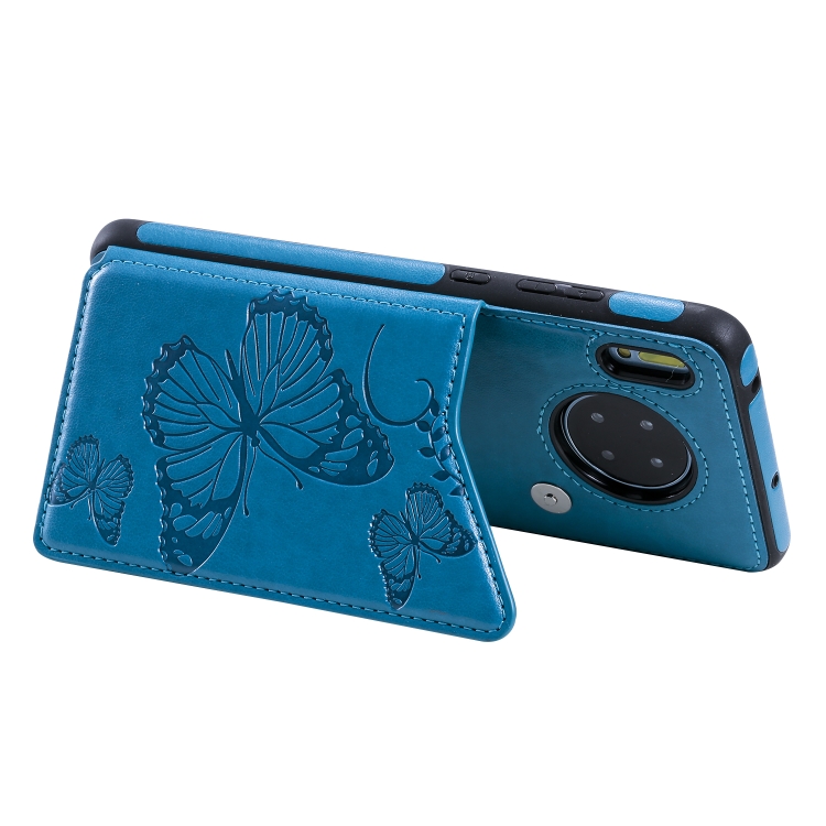 Funda Protectora Huawei Mate30 Estampado Mariposa con Soporte, Ranuras y Marco de Fotos (Azul)
