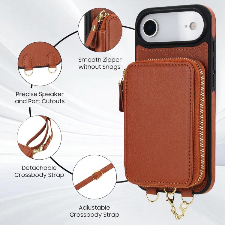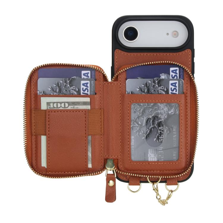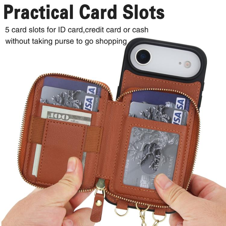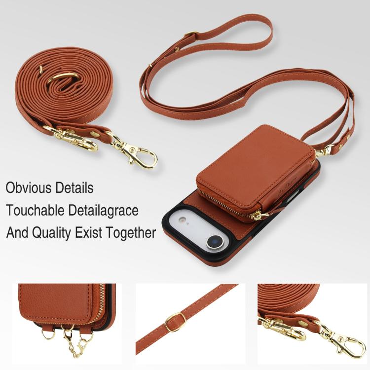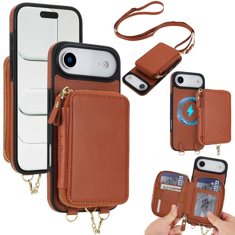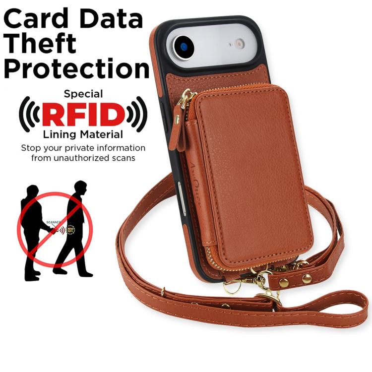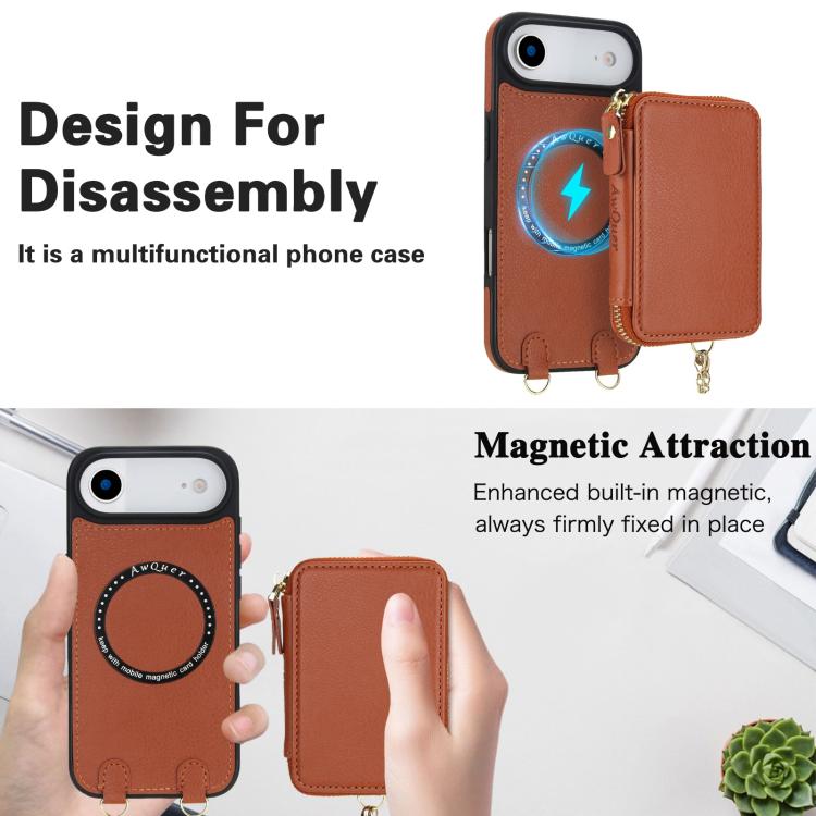 Funda tipo cartera bandolera con cremallera 2 en 1 AwQuer para iPhone Air, con parte trasera de cuero (marrón)