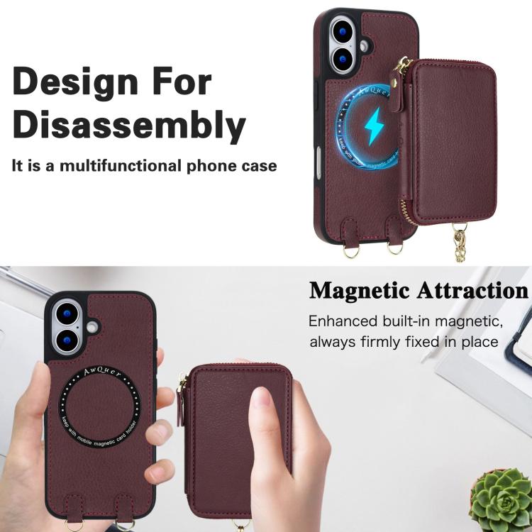 Funda tipo cartera bandolera con cremallera AwQuer 2 en 1 para iPhone 17, con parte trasera de cuero (rojo vino).