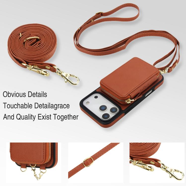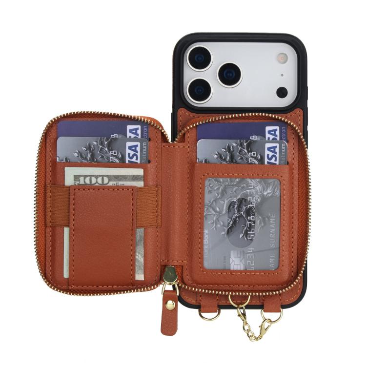 Funda tipo cartera bandolera con cremallera AwQuer 2 en 1 para iPhone 17 Pro Max con parte trasera de cuero (marrón)