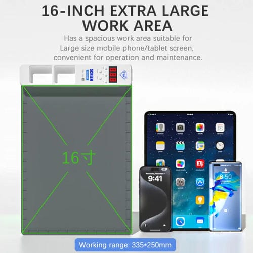 • Potencia de 300W, calentamiento rápido de 0 a 120 °C, área de trabajo de 35 x 25 cm, dimensiones 38,5 x 25 x 2,9 cm, lámpara LED de alta potencia a prueba de polvo