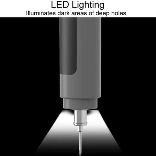 • Torque de salida estándar: 0,35-2,5 kgf.cm; Velocidad de salida: 750-850 r/min; Capacidad Batería: 2500 mAh; Dimensiones: 194x52x35 mm; Peso: 280 g; Jornada laboral: más de 4 horas; Puerto de Carga: tipo C; Iluminación LED incorporada