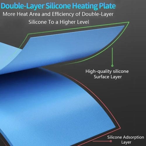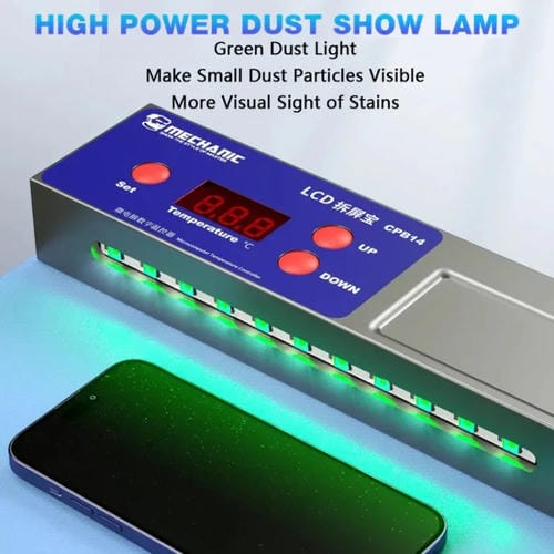 • Pantalla Digital LCD para visualización precisa de temperatura, calentamiento rápido a 120°C, área de trabajo de 295x210 mm, Puerto USB de salida 5V/2A, luz de Polvo verde de alta Potencia, diseño multifuncional con orificios para tornillos y área de colocación de Piezas