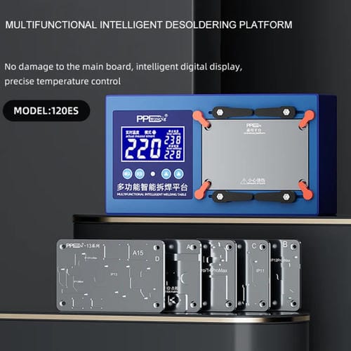 La Plataforma Desoldadora Inteligente Multifuncional PPD está diseñada para la Reparación especializada de modelos iPhone desde la serie 11 hasta la 14 Pro Max. Esta plataforma permite realizar desoldados precisos en Placas Principales sin causar daños, gracias a su Pantalla Digital inteligente y control de temperatura exacto. Su función Principal es facilitar el desmontaje y reemplazo de módulos internos, optimizando el proceso de Reparación con un calentamiento rápido y uniforme. Además, incorpora un diseño resistente a altas temperaturas que previene deformaciones y quemaduras, asegurando un uso seguro y eficiente para Técnicos y usuarios con experiencia en Reparación de dispositivos Apple.