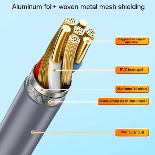 • Interfaz niquelada resistente a la corrosión y oxidación, blindaje de papel de aluminio y doble malla metálica, diseño ergonómico con moldura de Conector y cola de malla reforzada, longitud de 5 metros