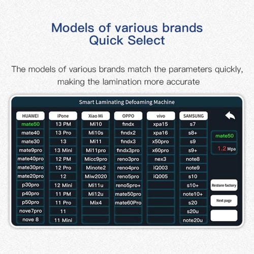 La Máquina de Laminación y Desespumado TBK208C es un equipo profesional diseñado para la Reparación y mantenimiento de Pantallas curvas y rectas de dispositivos Móviles y Tablets de hasta 15 pulgadas. Compatible con una amplia variedad de modelos y marcas del mercado, esta Máquina integra funciones inteligentes para realizar procesos de laminación al vacío y eliminación de burbujas con alta precisión y estabilidad. Su sistema avanzado incluye un cilindro de varilla grande de 125 mm y cuatro varillas guía que sincronizan la presión y el laminado, garantizando resultados uniformes y efectivos. Además, cuenta con un diseño ergonómico y una interfaz sencilla que facilita su operación para usuarios con conocimientos Técnicos en Reparación de Pantallas. El equipo incluye un Enchufe estándar de USA y ofrece una capacidad que admite la mayoría de los tamaños comunes de Tablets, desde 7 hasta 12.9 pulgadas.