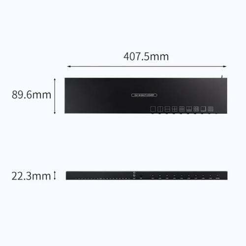 • Resolución soportada: 4K 30Hz, 1080P 60Hz, 720P 60Hz; Entrada HDMI x16; Salida HDMI x1; Ancho de Banda 60Hz; Fuente de Alimentación CC 12 V 2 A; Temperatura de trabajo: -50 a 80 °C; Dimensiones: 407,5x89,6x22,3 mm; Peso: 0,97 kg