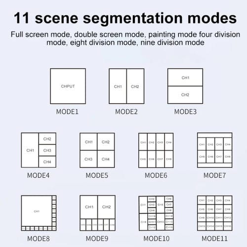 • Permite la división de Pantalla en 11 modos diferentes, incluyendo Pantalla Completa, dual, imagen fuera de imagen, y divisiones múltiples hasta 16 Pantallas