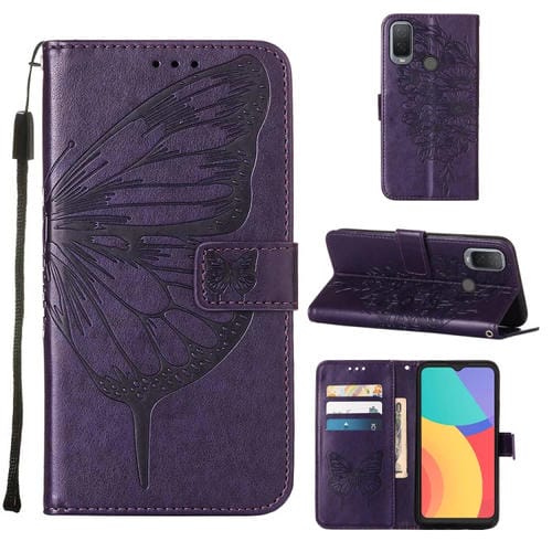 Funda de Cuero para Alcatel 1L 2021 con Mariposa en Relieve (Morado Oscuro)