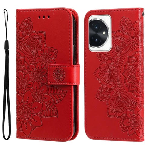 Funda para Teléfono Honor 100 de Cuero con Estampado de Flores de 7 Pétalos (Rojo)