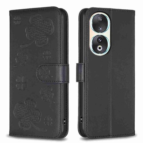 Funda de Cuero para Honor 90 5G con Relieve de Cuatro Hojas (Negro)