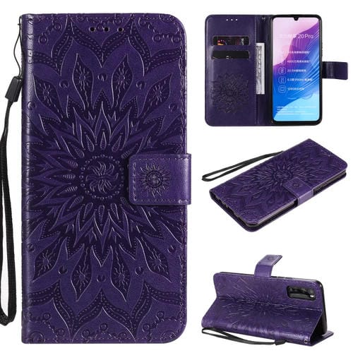Para Huawei Enjoy Z Impresión prensada Patrón de girasol con tapa horizontal Funda de cuero PU Soporte y ranuras para tarjetas y billetera y cordón (púrpura)