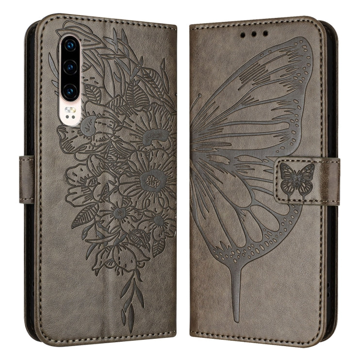 Funda de Cuero para Huawei P30 con Mariposa en Relieve (Gris)