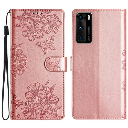 Funda para Huawei P40 Cherry Blossom Butterfly Skin Feel de PU en Relieve (Oro Rosa)