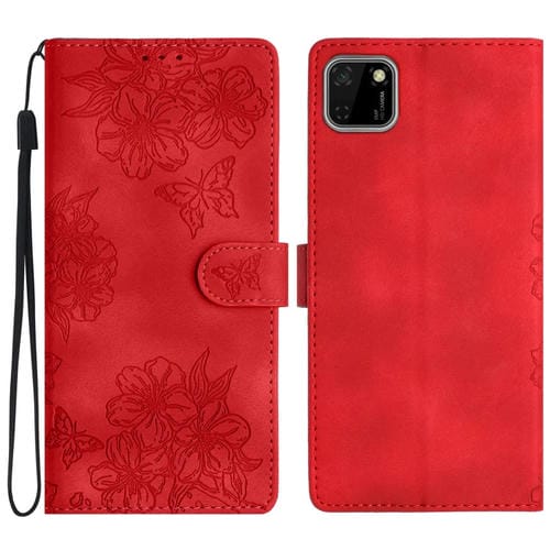 - 1x Funda para Huawei Y5P Honor 9S Cherry Blossom Butterfly Skin Feel PU Relieve (Rojo)