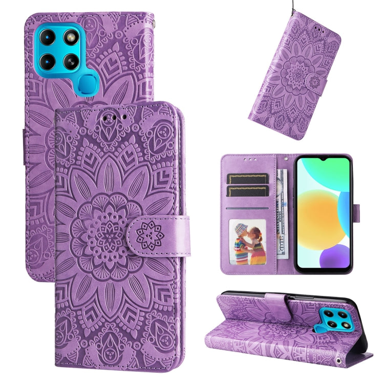 Estuche para Teléfono Infinix Smart 6 Cuero con Estampado de Girasol en Relieve (Púrpura)