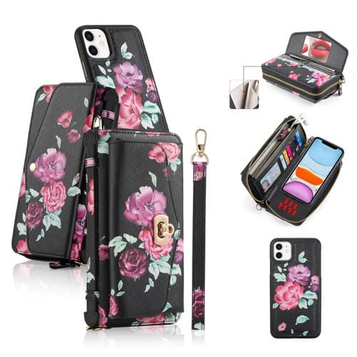 Funda para Teléfono iPhone 11 Pola Flower Cuero con Billetera y Cremallera Cruzada Multifuncional (Negro)