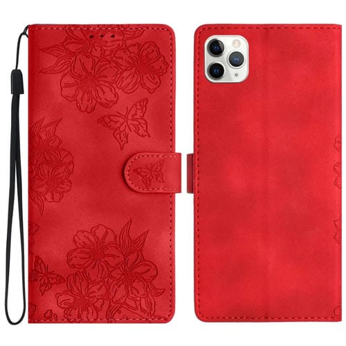 Funda para Teléfono iPhone 11 Pro Cherry Blossom Butterfly Skin Feel Pu En Relieve (Rojo)