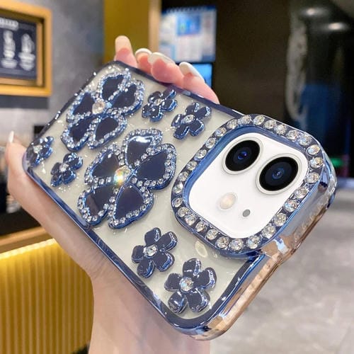 Caja de teléfono TPU para iPhone 12 con diamantes y flores galvanoplastia (Azul)