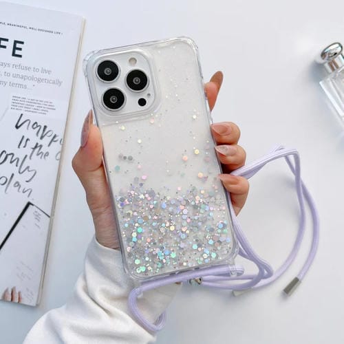 Funda para iPhone 12 Mini Lanyard Glitter Epoxy Clear Phone Case (Púrpura)