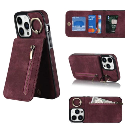 Funda para Teléfono iPhone 12 Pro Max Anillo Retro y Cremallera Ranura para Tarjeta Rfid (Rojo Vino)