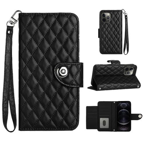 Funda para Teléfono iPhone 12 Pro Max con Tapa de Cuero Textura Rómbica y Cordón (Negro)