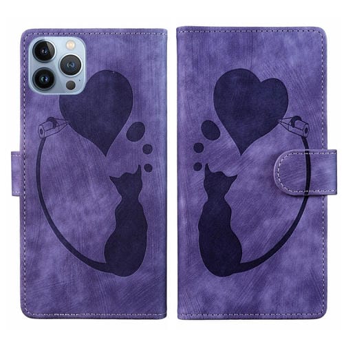 Funda de Cuero iPhone 12 Pro Max Pen Heart Cat En Relieve (Púrpura)