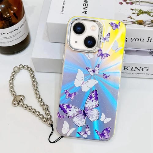 Estuche para teléfono iPhone 13 con Mariposa Láser y Galvanoplastia con Correa para la Muñeca (Mariposas Moradas Blancas)