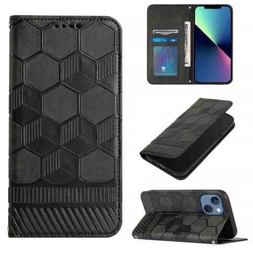 Funda de teléfono iPhone 13 Mini con tapa de cuero magnético textura de fútbol (Negro)