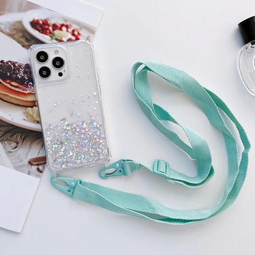 Funda para iPhone 13 Mini Lanyard Glitter Epoxy Clear Phone Case (Azul)
