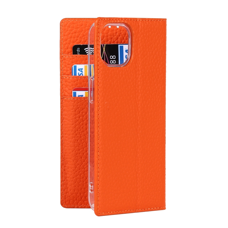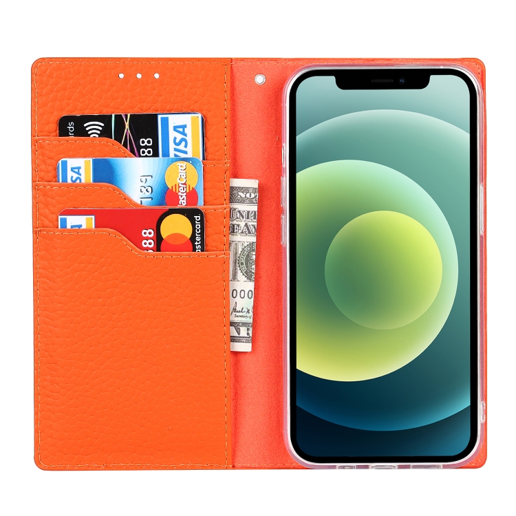 Funda de Teléfono iPhone 13 Mini Cuero Genuino Litchi Texture con Cordón Soporte Ranuras Tarjetas Billetera (Naranja)