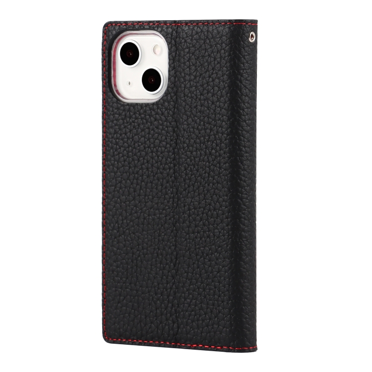 Funda de teléfono iPhone 13 Mini Cuero Genuino Litchi Texture con Cordón Soporte y Ranuras para Tarjetas y Billetera (Negro)