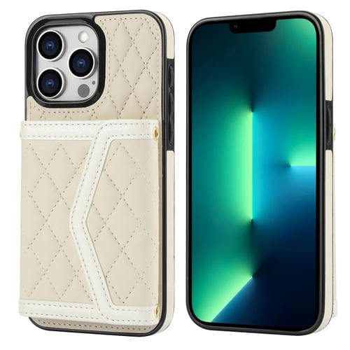 Estuche para Teléfono iPhone 13 Pro con Bolsa para Tarjetas Textura Rómbica y Cordón Largo (Beige)