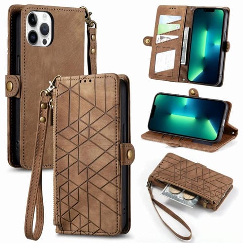Funda de Cuero para iPhone 13 Pro Max con Cremallera Geométrica y Hebilla Lateral (Marrón)