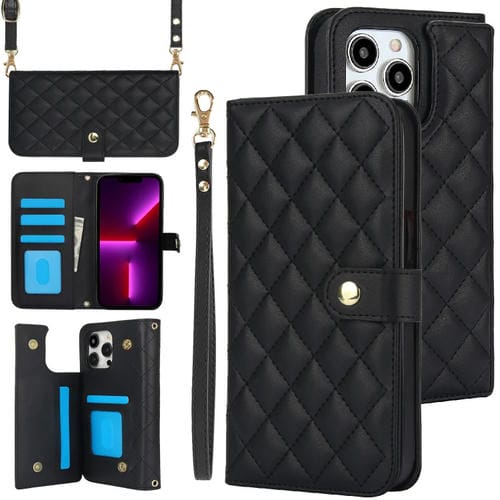 Estuche para Teléfono iPhone 13 Pro Max Crossbody Cuero Rómbico Multifunción (Negro)