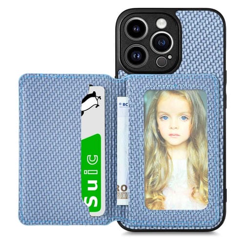 Funda de teléfono iPhone 13 Pro Max con bolsa de tarjeta magnética de fibra de carbono (Azul)