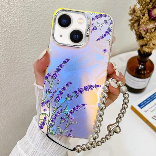 Funda para teléfono iPhone 14 con flor láser galvanizada y correa para la muñeca (Lavender)