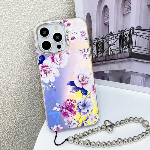 Estuche para teléfono iPhone 14 Pro Max con flor láser galvanizada y correa para muñeca (Peony Ah11)